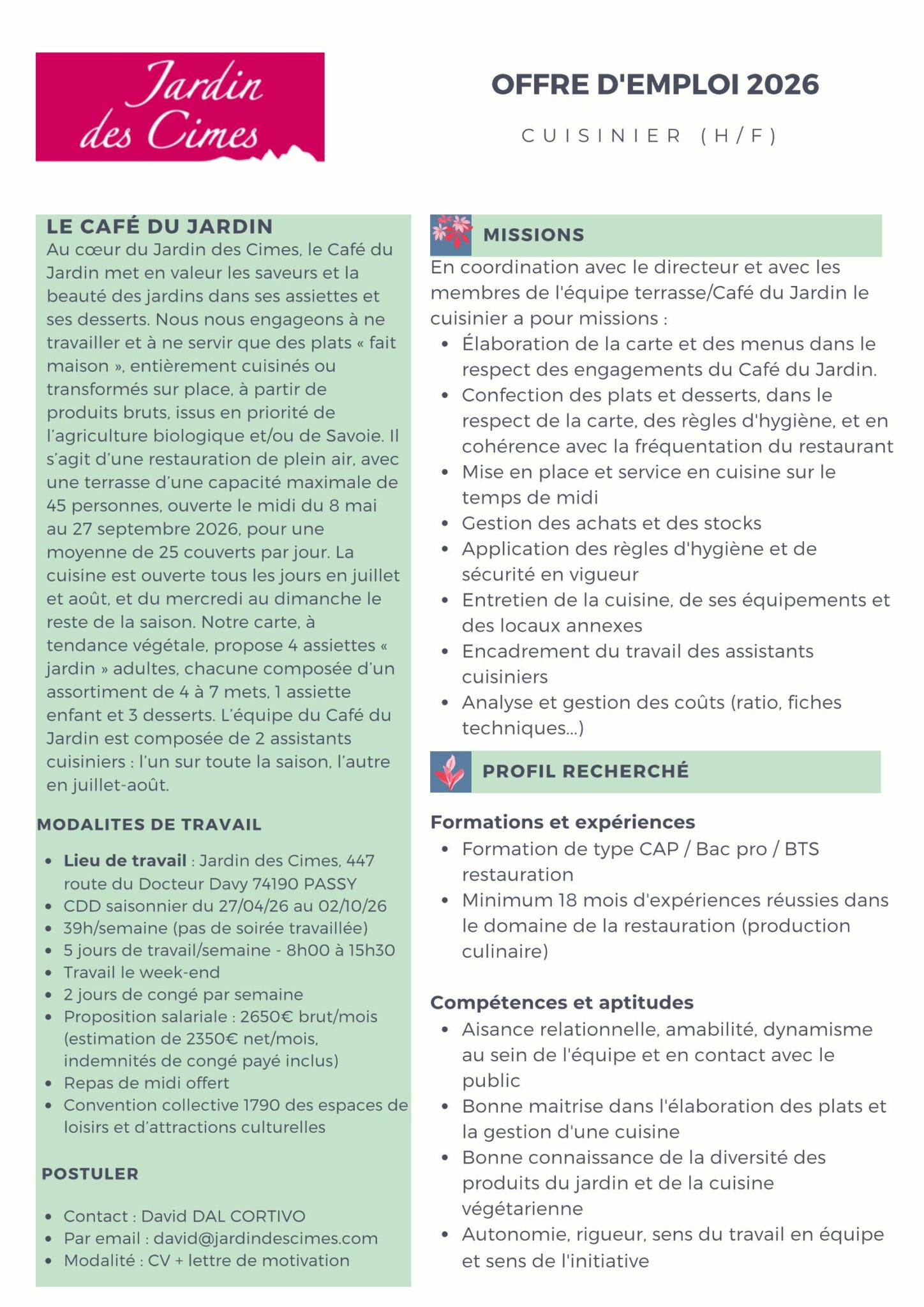 Envoyez votre CV et quelques mots de motivation à david@jardindescimes.com ou contactez David Dal Cortivo au 06 20 57 41 97.
